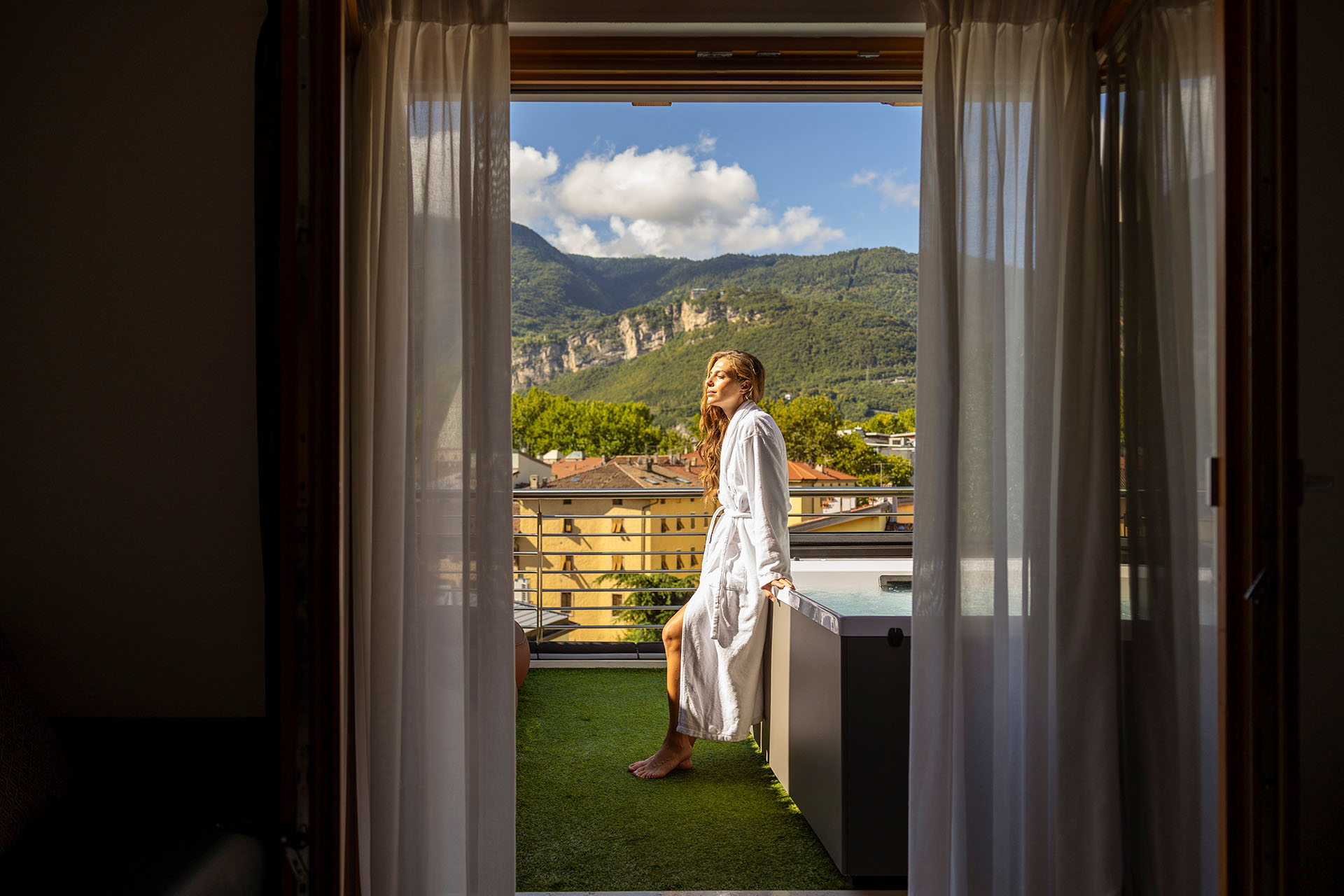 Gemütlich und hell, bietet dieses geräumige Zimmer für zwei Personen einen atemberaubenden Blick auf das Zentrum von Trient, das Schloss Buonconsiglio und den Monte Bondone. Die private Terrasse mit Whirlpool lädt zum Entspannen ein. Jeder Komfort ist vorhanden: eigenes Bad, TV, Kühlschrank, Safe, Schreibtisch, Haartrockner und Panoramabalkon.
